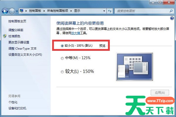 3、接着打开“放大或缩小文本和其他项目” 之后,我们点击右边的“较小(s)-100%(默认)”,之后点击应用按钮;