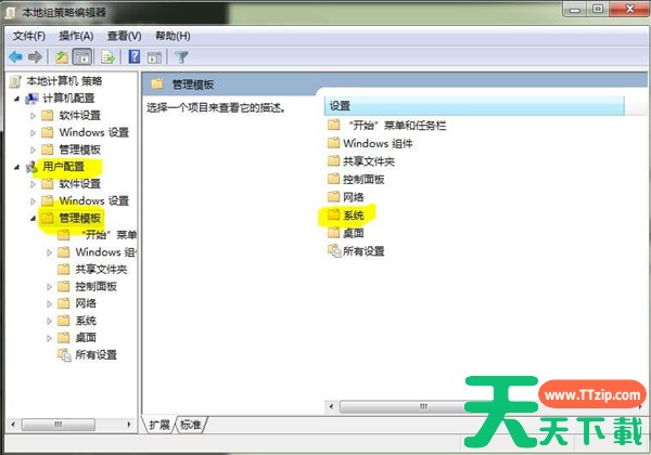 2、在组策略编辑器中左边”用户配置“下找到”管理模板“,点击打开。在界面的右侧找到”系统“,双击打开。
