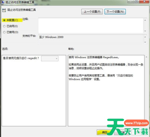 4、在弹出的窗口中,选择”未配置“,这样就关闭了注册表编辑工具的禁用,然后重试一下即可打开注册表。