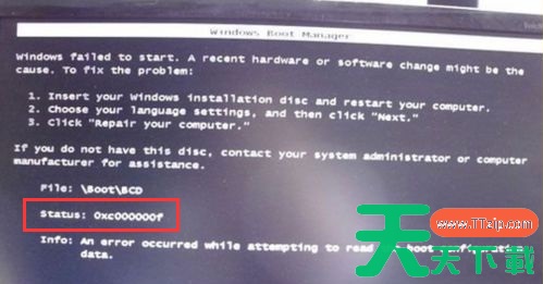 近期有部分用户在开机的时候出现错误0xc000000f的情况,这是怎么回事呢?对于这种情况应该如何解决呢?出现这种情况很有可能是因为启动文件丢失或损坏,下面天天下载Ttzip就为大家带来修复方法介绍,一起来看看吧!