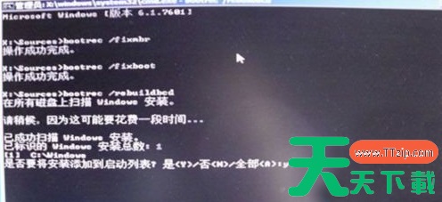6、在命令行窗口依次输入:BOOTREC /FIXMBR,按下回车键、输入:BOOTREC /FIXBOOT,按回车键、输入:BOOTREC /REBUILDBCD,按回车键,按照屏幕提示选择输入“Y”并按下回车,最后输入“exit”按下回车退出命令提示符。