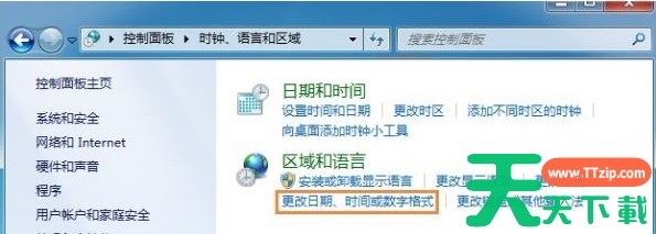 3、进入“时钟、语言和区域”窗口后,点击“更改日期、时间或数字格式”;