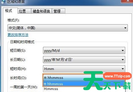 4、随后来到“区域和语言”窗口,我们在“日期和时间格式”下方将“长时间”设置为“tt hh:mm:ss”,然后点击“确定”即可。