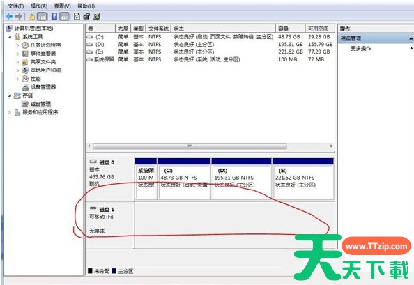 最近有用户反映在使用电脑的时候,遇到系统提示驱动器中没有磁盘的问题?那么,我们要如何解决这种情况?这里天天下载Ttzip为大家带来Win7电脑提示驱动器中没有软盘解决方法,快来看看吧! Win7电脑提示驱动器中没有软盘解决方法 1、打开磁盘管理器,右键单击计算机管理磁盘管理器,进入磁盘管理器。 找到问题的驱动器号,这里是F盘 2、禁用此磁盘:右键单击属性,找到驱动程序选项卡项,然后单击“禁用”。 这将解决问题。 以上就是Win7电脑提示驱动器中没有软盘的解决方法,希望能帮助到大家! 除特别注明外,本站所有文章均为 天天下载 原创,转载请注明出处来自 https://www.ttzip.com/213361.html