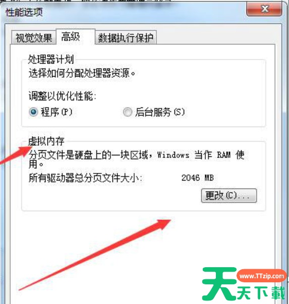 5、再选择【高级】,找到虚拟内存,点击更改,等待电脑自动调整虚拟内存,然后重启电脑即可。