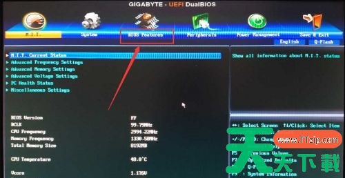 2、然后选择“bios features”如果鼠标不能用就有键盘方向键。