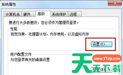 3、在系统属性页面中,选择第一项,性能后面的【设置】字样的按钮;