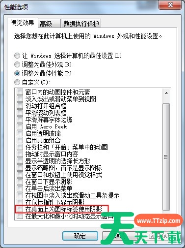 4.在性能选项的“视觉效果标签”中找到“在合作面为图标标签使用阴影”的项目,将前面的复选框勾去掉即可。然后再回到桌面看是否图标阴影还在。