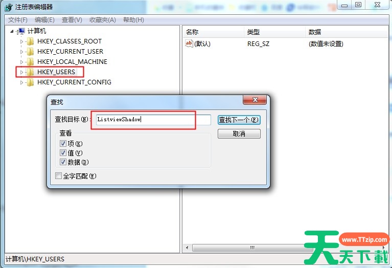 2.点选“HKEY_USERS”项,然后ctrl键+F打开搜索框,输入“ListviewShadow”点击“查找下一个”。