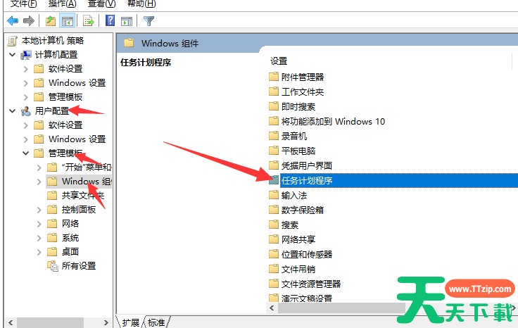 2、依次点击用户配置——管理模板——Windows组件,然后在右侧找到任务计划程序。