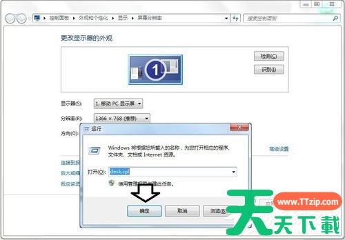 3、如果还能进操作系统,那就在运行中输入:desk.cpl →确定,打开设置分辨率的设置项→返回适合当前显示器的分辨率(通常是调低);