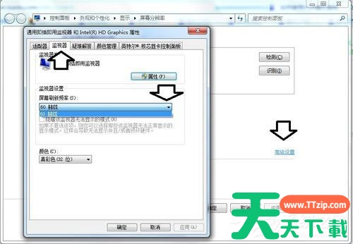 4、还有一种情况,用户擅自修改刷新率(调高),也会导致显示屏出现:超出工作频率范围的提示。调整方法:高级设置→监视器→屏幕刷新频率→60→确定;