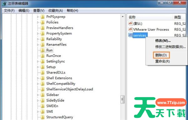 4、接着注册表依次展开HKEY_LOCAL_MACHNE\SOFTWARE\Microsoft\Windows\CurrentVersion\Run,在右边找到services选项并将其删除。