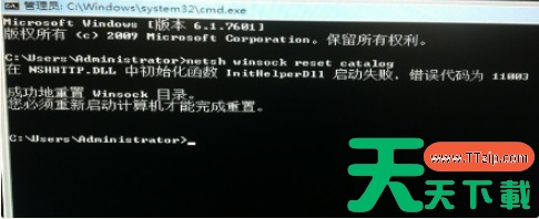 4、输入“netsh winsock reset catalog”敲击回车,然后重新启动计算机完成重置。