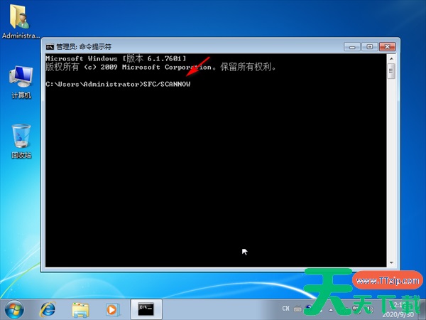 3、最后在弹出的提示符中输入SFC /SCANNOW命令,按回车键会自动修复缺失或已损坏的系统文件。
