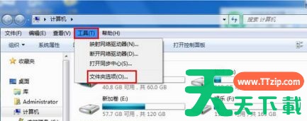 1、打开计算机磁盘管理窗口,点击展开“工具”下拉列表,然后点击“文件夹选项”。