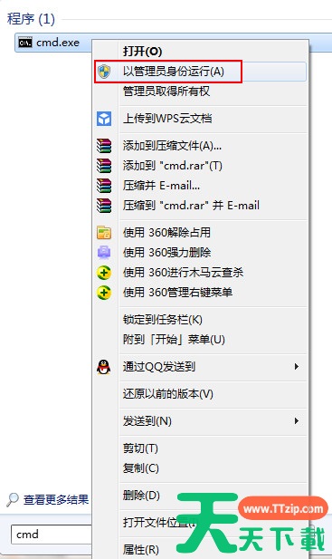 1、打开开始菜单,输入cmd,在搜索出的cmd程序右键选择以管理员身份运行,如下图所示。