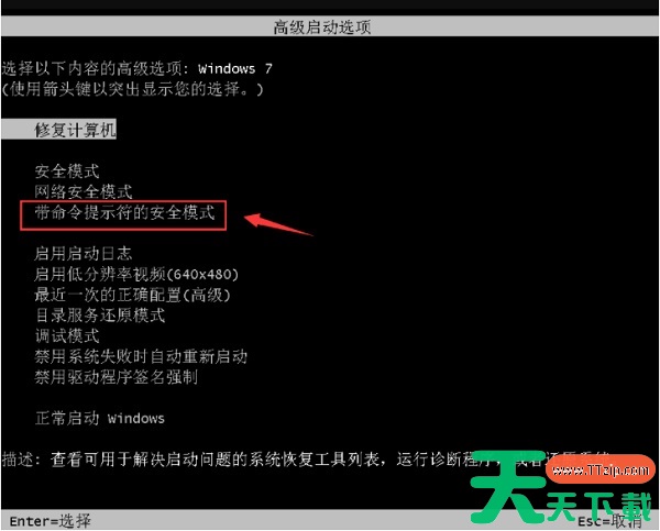 1、电脑重新开机,在开机画面出现之前,不断重复的按下F8键,进入高级确定选项页面,利用上下方向键移动至“带命令提示符的安全模式”选项,并回车。