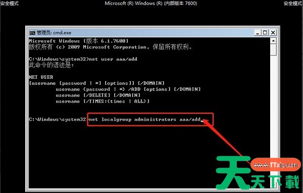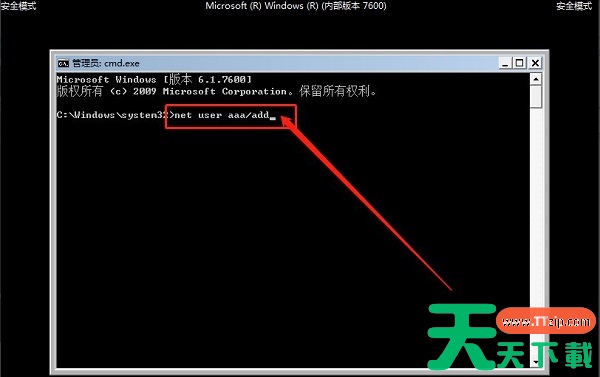2、随后,会出现安全模式下的“命令页面”,在页面中输入【net user aaa/add】并回车。