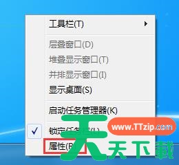 1、在任务栏右键点击,在菜单栏中选择属性;