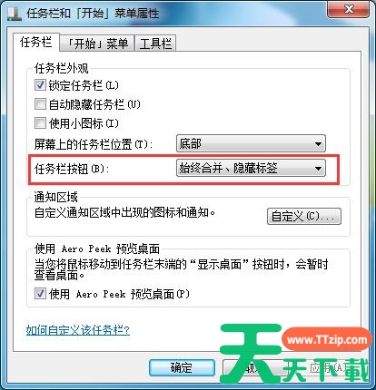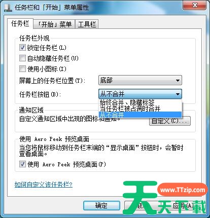 3、在任务栏按钮中,选择“从不合并”;