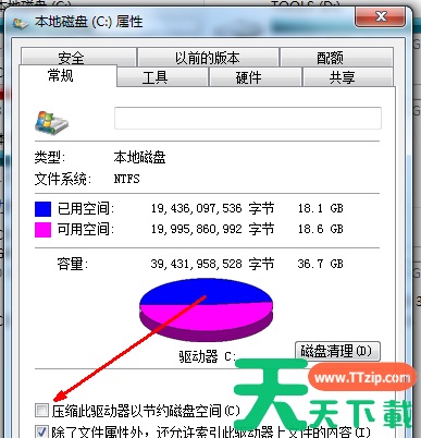7、如果电脑的磁盘空间实在太小,可以在属性页中选中压缩驱动器来节约磁盘空间,通过这种途径可以一定程度上节约空间。