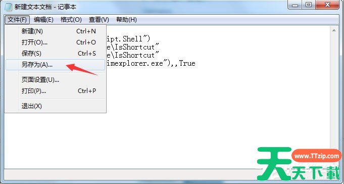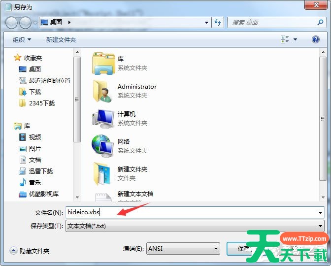 3、点击菜单栏→另存为→文件名栏里输入“hideico.vbs”点击“保存”;