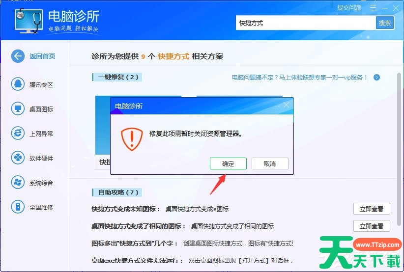 4、点击“去掉快捷方式小箭头”→点击“立即修复”;