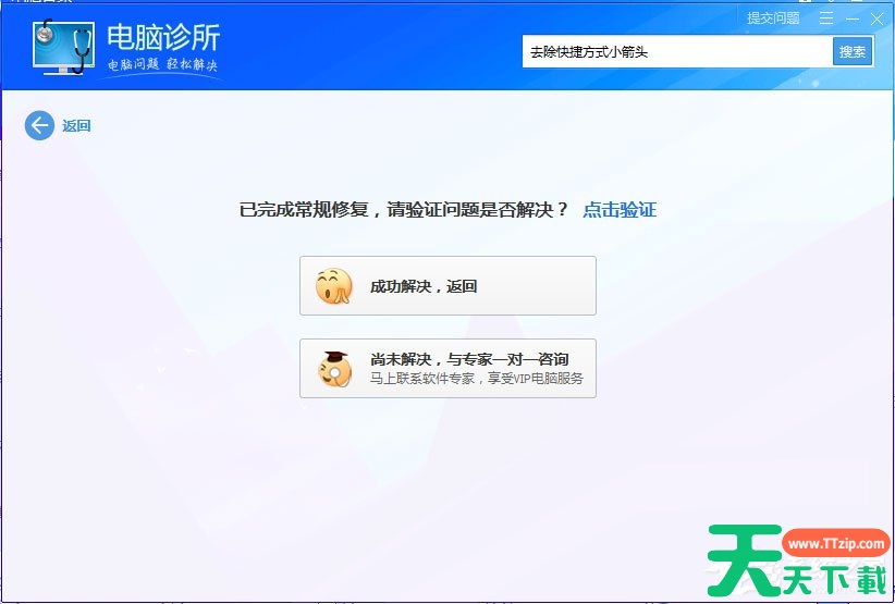 3、在“电脑诊所”搜索地址栏里输入“去除快捷方式小箭头”→点击“搜索”;