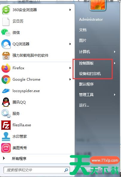 1、首先打开开始菜单,然后选择控制面板,点击设备和打印机。