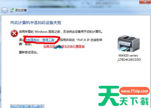 3、选择要添加的打印机,若是添加失败就会自动弹出,选控制面板-管理工具。
