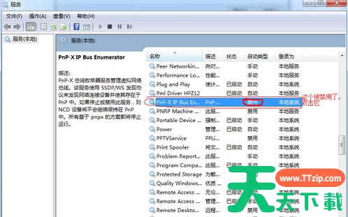 4、点击服务,下拉后选择PnP-X IP Bus Enumerator,这个被禁用了,双击它。