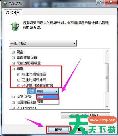 4、选择【睡眠 】【允许使用唤醒定时器】 设置【禁用】,点击确定【保存】设置。
