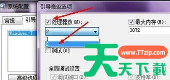 2、点击“引导”--“高级选项”,可以看到“处理器数”前面的复选框默认不是选定的,我们用鼠标选定它,如图所示,然后点击下面的菜单,你的处理器是几核的就会显示数字几,比如我的处理器是双核的,就显示2,然后我们就选择2,点击确定退出。