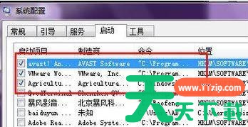 3、现在开始设置一下启动项了,启动项过多是导致系统启动慢的罪魁祸首,所以一定要减少启动项的数量 ,我的建议是除了杀毒软件,别的一概取消自动启动,一些常用的软件你可以等系统启动后再打开,至少我们不用忍受开机慢的折磨。如图所示,所有的启动项前面都会被选定,你可以看一下哪一个想让它自动启动。
