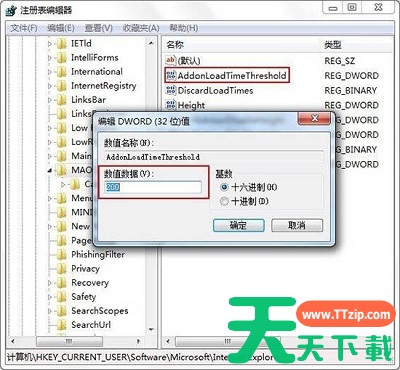 2、我们也可以通过注册表修改这个标准时间,以减少加载项提示通知,或者直接让它不再出现(把标准时间调的足够大)。请在开始菜单的搜索框中输入regedit并点击回车打开注册表编辑器。定位到下面的项: HKEY_CURRENT_USER\Software\Microsoft\Internet Explorer\MAO Settings 在右侧窗口,双击AddonLoadTimeThreshold值,把DWORD值改为十进制,值数修改为200(默认的0.2秒标准时间)。