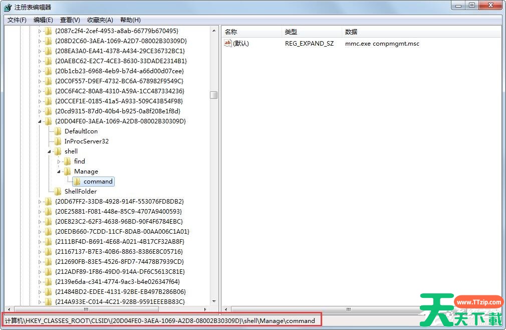 2、找到HKEY_CLASSES_ROOTCLSID{20D04FE0-3AEA-1069-A2D8-08002B30309D}shellManagecommand;