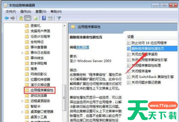 2、在本地组策略编辑器中,按照“计算机配置——管理模板——windows组件——应用程序兼容性”依次展开,然后在窗口右侧点击“删除程序兼容性属性页”。