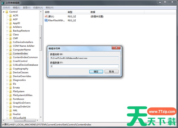 2、在打开的注册表编辑器中依次找到并点击“HKEY_LOCAL_MACHINE\SYSTEM\CurrentControlSet\Control\ContentIndex”选项,然后在右侧找到并双击“FilterFilesWithUnknownExtensions”。(如果没有可自行创建)。