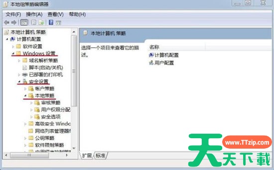 2、在本地组策略编辑器窗口,展开Windows设置 - 安全设置 - 本地策略。