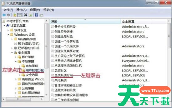 3、在本地策略中找到:用户权限分配,左键点击:用户权限分配,在用户权限分配对应的右侧窗口找到:更改系统时间,并左键双击:更改系统时间。