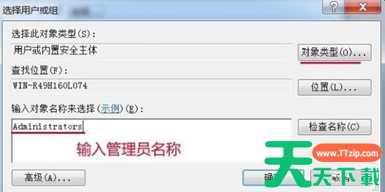 5、在选择用户或组窗口的输入对象名称来选择(U)栏中输入管理员名称:Administrators,再点击:对象类型(O)。