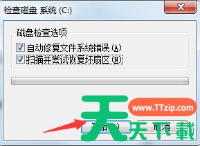 5、在磁盘检查选项界面,把自动修复文件系统错误和扫描并尝试恢复坏扇区勾选项然后点击下方的开始;