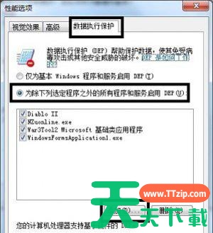 6、“数据执行保护”,选择“为除下列选定程序之外的所有程序和服务启用DEP(U)”,再点击下方的“添加”从硬盘中选中该程序即可。