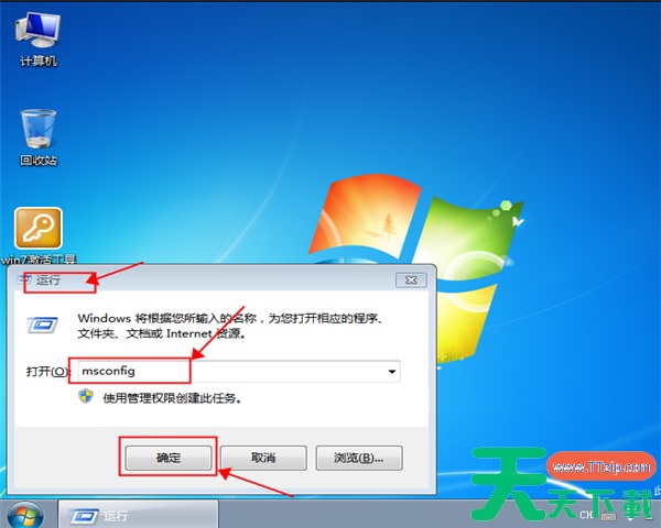 2、在【运行】菜单内输入【msconfig】点击【确定】。