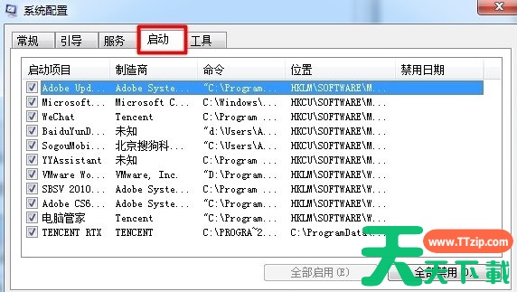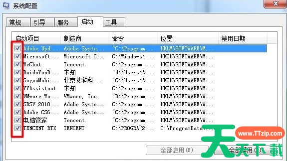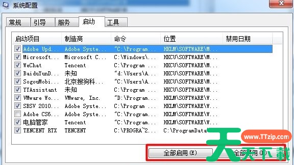 5、如果想全部启动或全部禁用,可以点击下面的“全部启动”或“全部禁用按钮”,如果某项不想选择,点击前面的小方框即可。