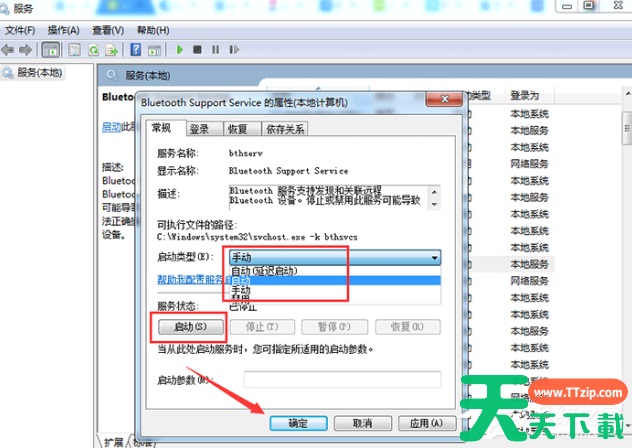 3、然后在Bluetooth Support Service属性的常规界面中,设置“启动类型”为自动,然后在“服务状态”中点击启动。最后点击“确定”就可以了。