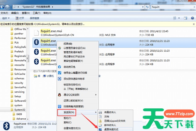 2、然后在弹出页面中输入“fsquirt”,在system32中找到应用程序fsquirt.exe。接着将光标移动到fsquirt.exe应用程序上,然后鼠标右击。点击“发送到”选择桌面快捷方式就可以了。
