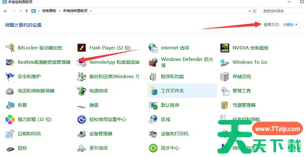 4、将查看方式改为大图标,找到Realtek高清晰音频管理器将其打开。