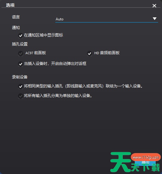 6、然后选择插入设备,开启自动弹出对话框,录制设备选择将相同类型的输入插孔联结为一个输入设备,最后点击确定即可。
